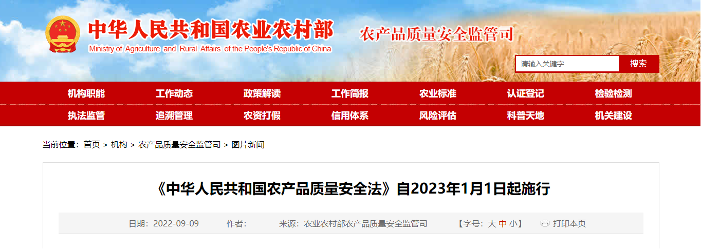 2022年9月2日,全國人大常委會第三十六次會議通過了修訂后的《農(nóng)產(chǎn)品質(zhì)量安全法》,自2023年1月1日起施行。新版《農(nóng)產(chǎn)品質(zhì)量安全法》將進一步加強從農(nóng)田到餐桌的全過程監(jiān)管。為全面體現(xiàn)“四個最嚴”的要求,新修訂的農(nóng)產(chǎn)品質(zhì)量安全法,在關(guān)于農(nóng)產(chǎn)品質(zhì)量安全的定義中增加生產(chǎn)經(jīng)營的農(nóng)產(chǎn)品達到農(nóng)產(chǎn)品質(zhì)量安全標準的內(nèi)容;在國家建立健全農(nóng)產(chǎn)品質(zhì)量安全標準體系的基礎(chǔ)上,明確要求“確保嚴格實施”;在農(nóng)產(chǎn)品質(zhì)量安全標準中增加“儲存、運輸”農(nóng)產(chǎn)品過程中的質(zhì)量安全管理要求。