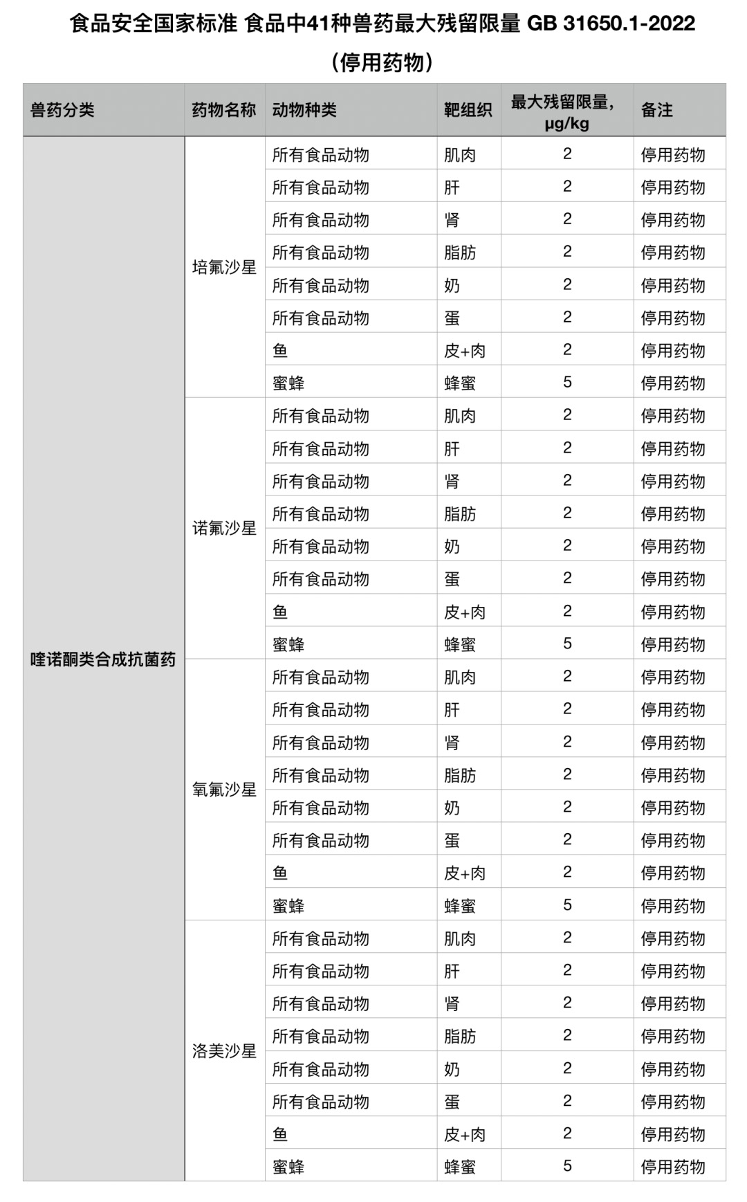 關(guān)于靶組織為“蜂蜜”的標(biāo)準(zhǔn)4項(xiàng),增加停用藥物限量(氧氟沙星5μg/kg、諾氟沙星5 μg/kg、培氟沙星5 μg/kg和洛美沙星5 μg/kg)。