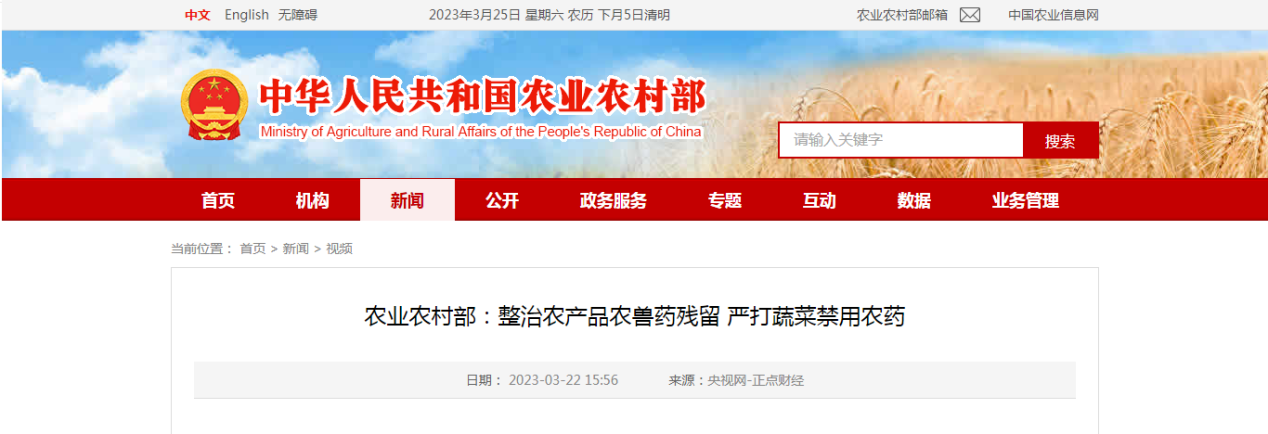 3月21日, 農(nóng)業(yè)農(nóng)村部 ”2023年全國農(nóng)產(chǎn)品質(zhì)量安全監(jiān)管工作會議“在云南省昆明市召開。會議表示,針對一些農(nóng)產(chǎn)品農(nóng)獸藥殘留方面的突出問題將在嚴打蔬菜禁用農(nóng)藥源頭上下功夫。據(jù)介紹,2022年全國農(nóng)產(chǎn)品監(jiān)測合格率達到97.6%,農(nóng)產(chǎn)品質(zhì)量安全形勢持續(xù)向好。但是,農(nóng)產(chǎn)品質(zhì)量安全隱患依然不少,禁用藥物的違法使用雖有下降但并未杜絕,防止常規(guī)農(nóng)藥超標成為新時期的重要任務。