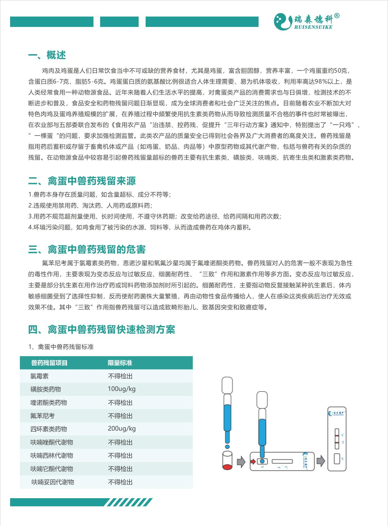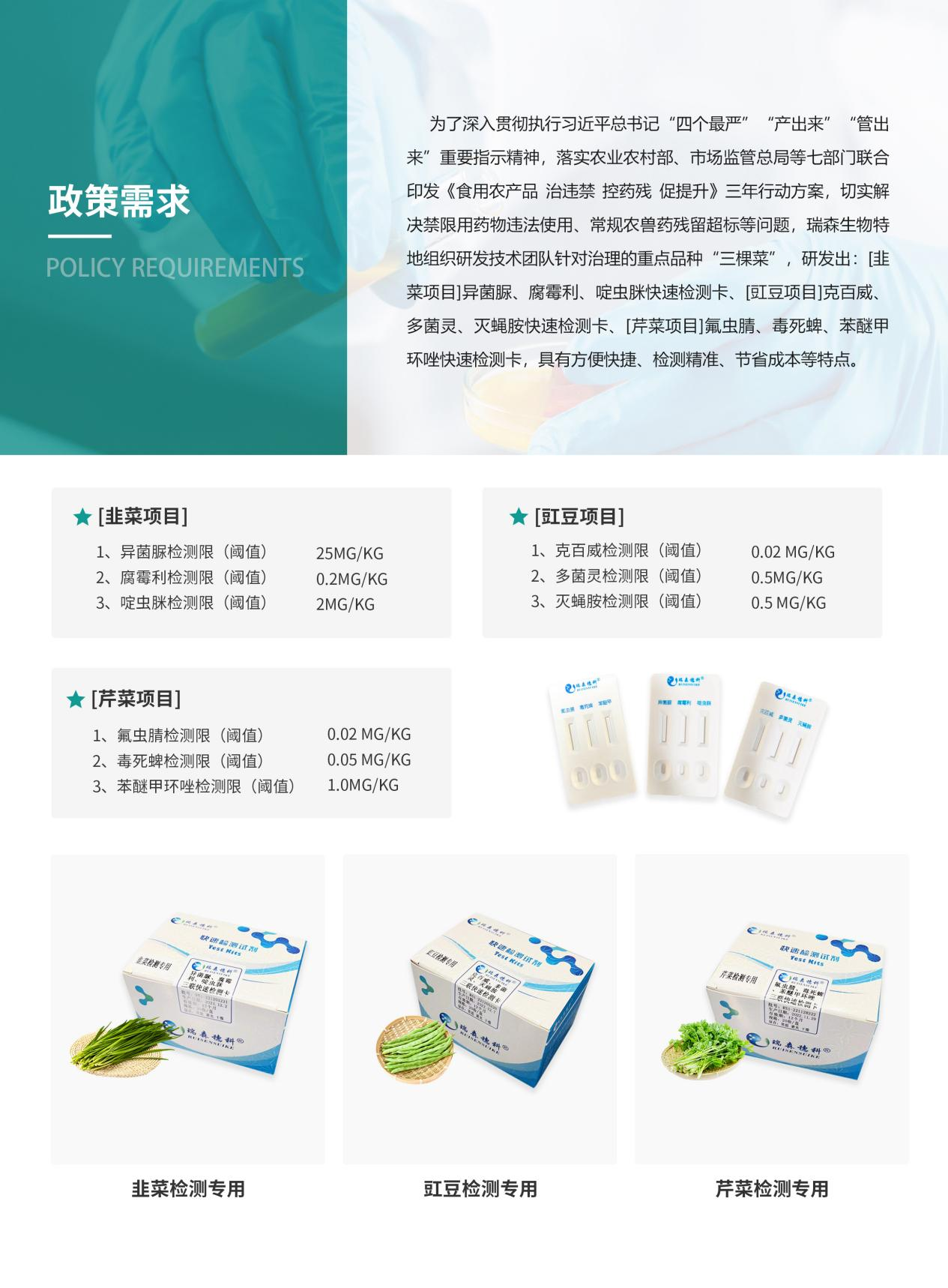 瑞森生物認真學習和貫徹農(nóng)業(yè)農(nóng)村部2023年全國農(nóng)產(chǎn)品質(zhì)量安全監(jiān)管工作會議精神,積極擁護和響應《中華人民共和國食品安全法》。早在2021年國家農(nóng)業(yè)農(nóng)村部發(fā)布了《食用農(nóng)產(chǎn)品“治違禁 控藥殘 促提升”三年行動方案》的通知后,瑞森生物就積極擁護和響應文件精神,并針對《方案》中提到的需要重點治理的11種農(nóng)產(chǎn)品:“三棵菜”、“一枚蛋”、“一只雞”、”肉牛肉羊“、“四條魚”,推出了相關(guān)的新品應對方案,包括”農(nóng)藥殘留膠體金多聯(lián)檢測產(chǎn)品系列“、”禽蛋藥殘專項檢測解決方案“、”熒光定量快速檢測產(chǎn)品“等相關(guān)技術(shù)領先的新型檢測產(chǎn)品。有效解決了國家食用農(nóng)產(chǎn)品存在的安全隱患問題,充分保障了老百姓”菜籃子“上的安全。