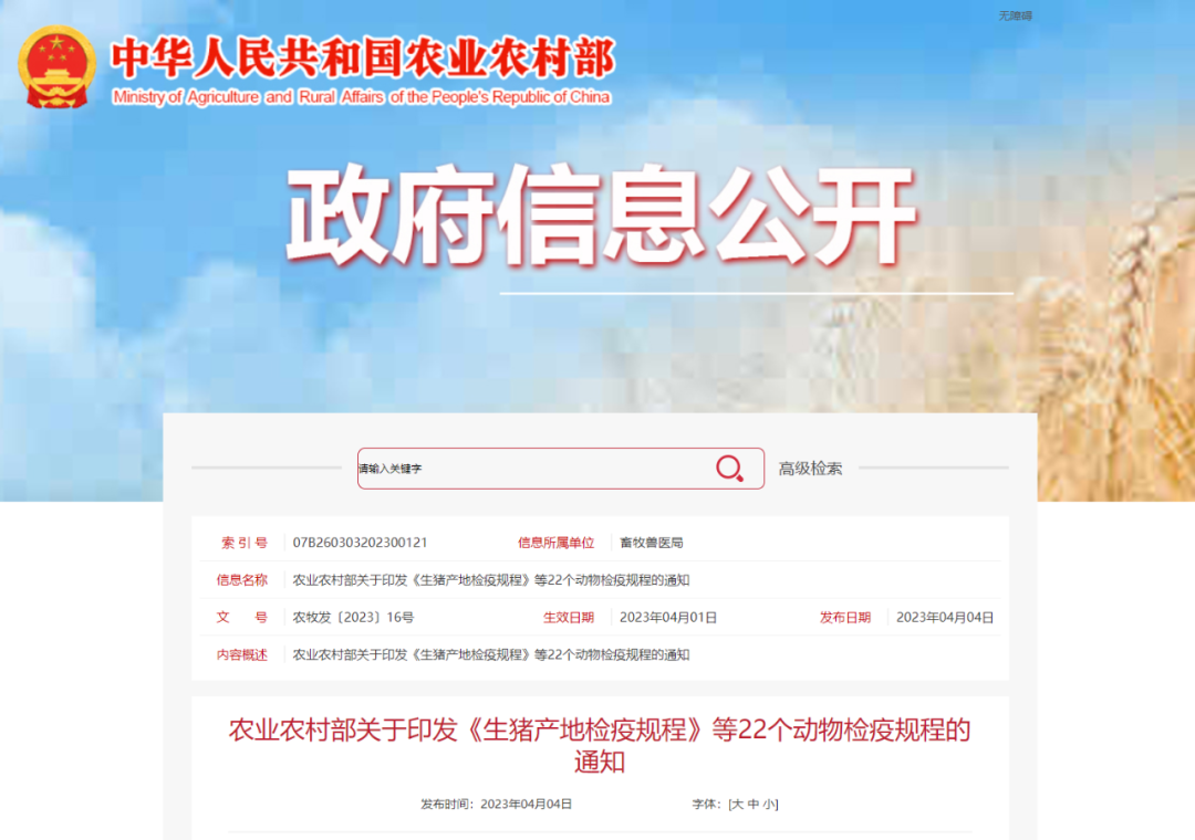 政策發(fā)文 | 農(nóng)業(yè)農(nóng)村部關(guān)于印發(fā)《生豬產(chǎn)地檢疫規(guī)程》等22個(gè)動(dòng)物檢疫規(guī)程的通知